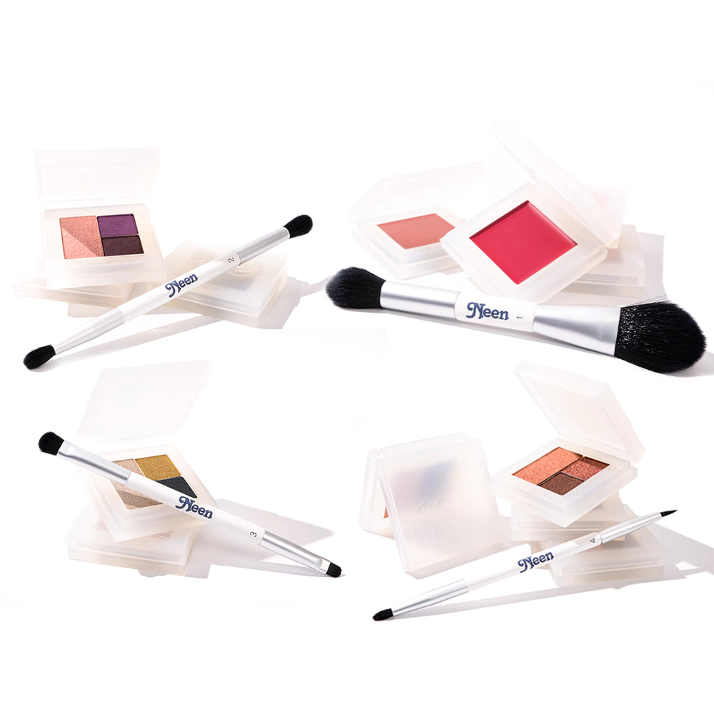 Get all four of our vegan dual-ended brushes. This quad set comes with a 20% discount and includes our Duo Cheek & Lip Brush (#1), Duo Fluffy Eyeshadow (#2) Brush, Duo Precision Brush (#3), and Duo Liner Brush (#4).